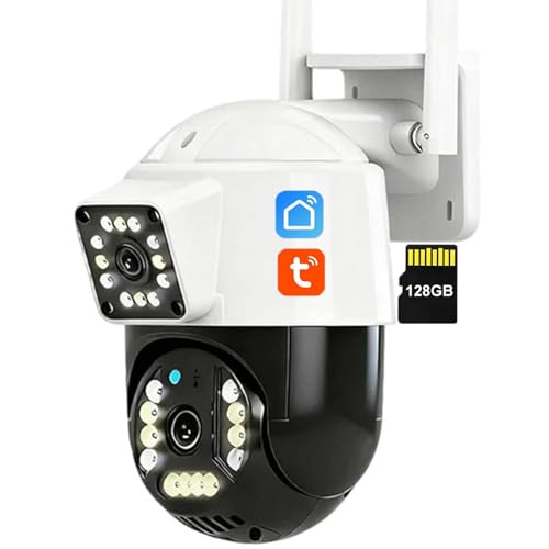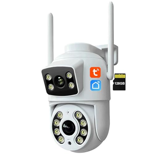 Zysfadc Caméra De Sécurité Tuya PTZ WiFi À Double Objectif (3MP+3MP), Caméra IP 2,4G/5GHZ avec Double Vue, Vision Nocturne, Sirène, Projecteur Et Audio Bidirectionnel,Camera+128g