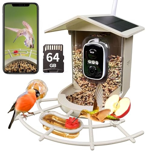 Origem Mangeoire à Oiseaux avec Caméra, Panneau Solaire 3W, Batterie Rechargeable 5200mAh, 1,7 L Mangeoire Oiseaux Extérieur, Vidéo 2K, Carte SD 64 Go, Grand Angle 130° pour Cour, Ferme et Jardin