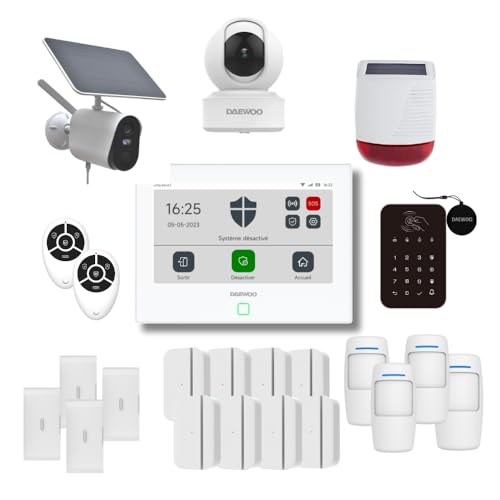 Daewoo Pack Alarme AM373, WiFi/GSM, Centrale à écran Tactile 7'', 20 Accessoires, Sirène Solaire, Livrée avec 2 Caméras Full HD Dont 1 Caméra Solaire