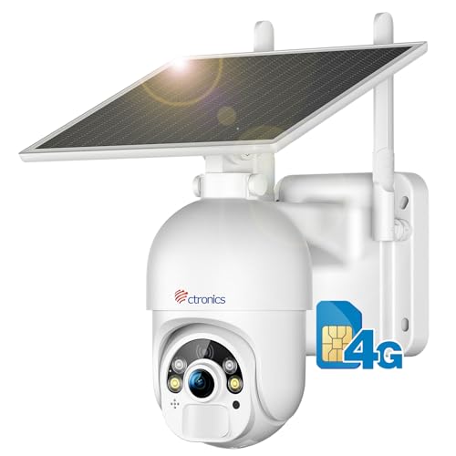 Ctronics 2,5K 4MP 3G/4G LTE Caméra Solaire, Camera Carte Sim sans Fil 4g, Audio Bidirectionnel, Pan 355 Tilt 90 Zoom Détection Humaine PIR, Caméra Solaire Compatible Téléphone/Tablette/PC, IP66