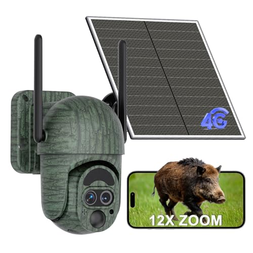 NUASI Caméra de Chasse 4G avec Carte SIM, 12X Zoom Hybride Caméra Surveillance Solaire Exterieure sans Fil, 360° PTZ, Audio Bidirectionnel, PIR Détection, Vision Nocturne, Etanche IP66
