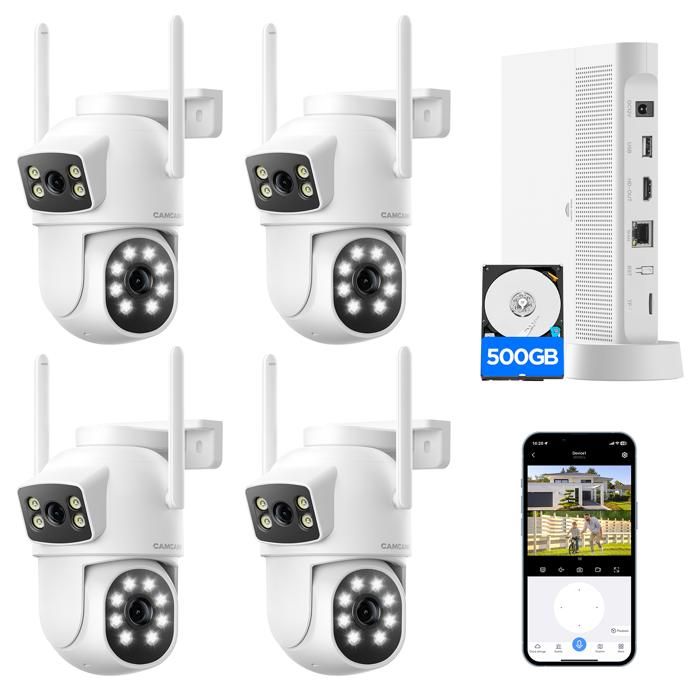 CAMCAMP Kit Caméra de Surveillance WiFi Extérieur sans fil 2MP+2MP Double Objectif 10CH NVR 500GB Disque dur Vision Nocturne