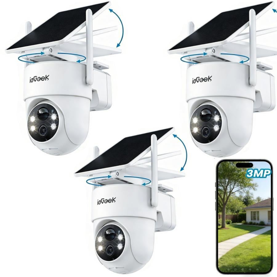 Caméra de surveillance d'extérieur ieGeek 2K, caméra Wi-Fi solaire, caméra d'extérieur avec panneau solaire, PTZ 360°, vision nocturne couleur, audio bidirectionnel, détecteur de mouvement PIR, lot de 3