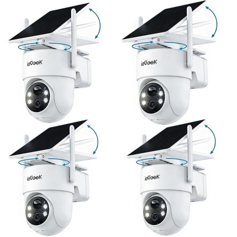 Caméra de surveillance d'extérieur ieGeek 2K, caméra Wi-Fi solaire, caméra d'extérieur avec panneau solaire, PTZ 360°, vision nocturne couleur, audio bidirectionnel, détecteur de mouvement PIR, lot de 4