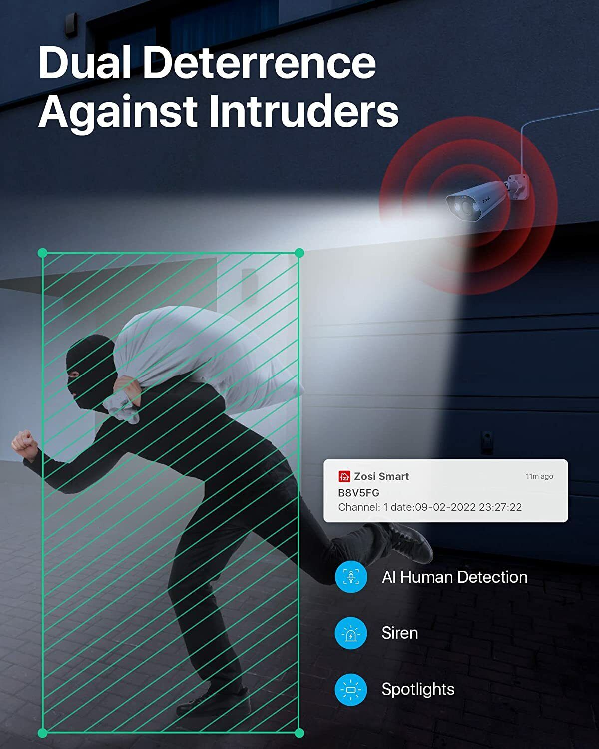 ZOSI Caméra de sécurité CCTV, résolution 5MP, détection humaine IA, 5MP PAS de carte TF x 2