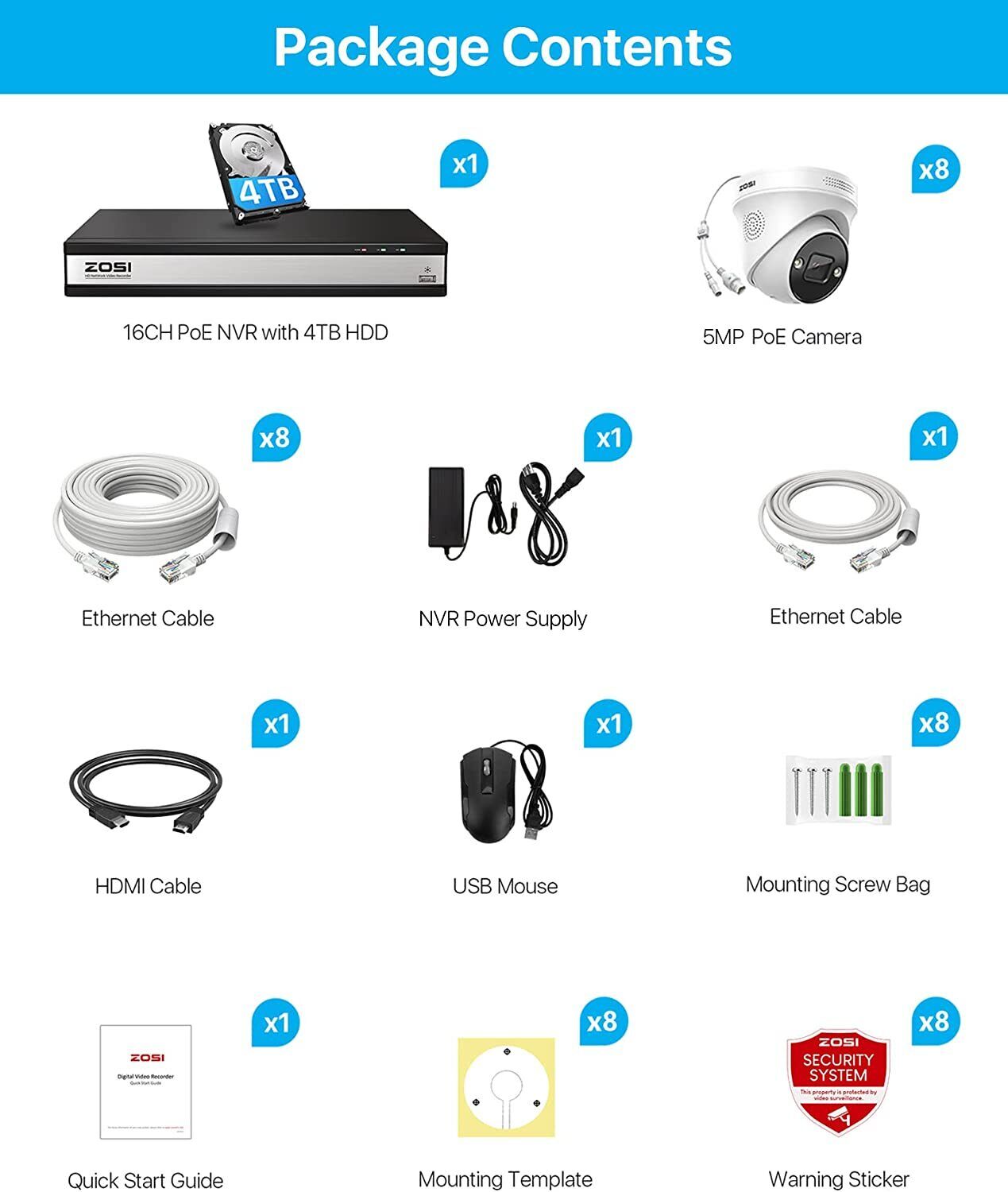 ZOSI 5MP PoE Kit Caméra de Surveillance 16pcs 5MP Caméra 16CH 4K NVR HDD de 4To
