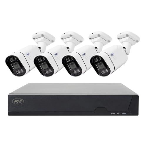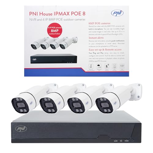 PNI House IPMAX POE-8 Kit de vidéosurveillance avec NVR et 4 caméras-IP, résolution 8MP, Vision Nocturne, détection de Mouvement, étanchéité IP66, Compatible avec Technologie-IP
