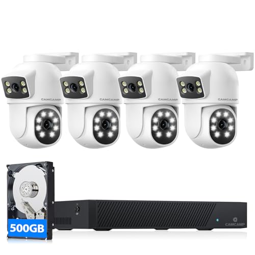 Camcamp Kit Video Surveillance POE PTZ Double Objectif, 8CH NVR Kit Caméra de Surveillance POE Extérieure avec 500GB HDD et 4X4MP Caméras IP PoE,360° Vision Nocturne Couleur,Enregistrement 24/7,IP66