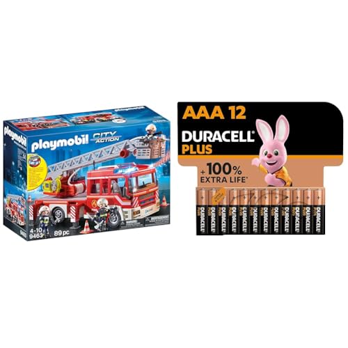 Playmobil - Camion de Pompiers avec Échelle Pivotante - 9463 + Piles alcalines AAA Duracell Plus, 1.5V LR03 MN2400, Paquet de 12