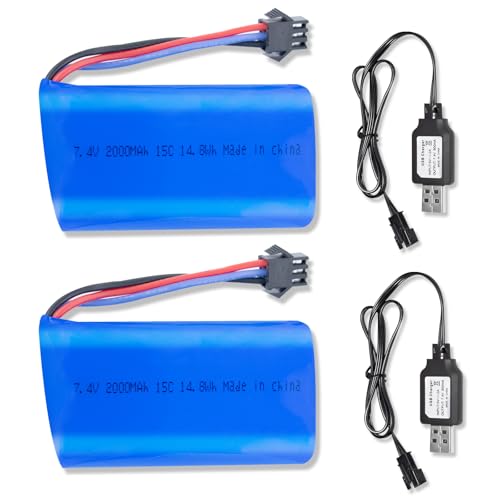 BORSCELLOR Lot de 2 batteries Li-ion 7,4 V 2000 mAh 15C 2S avec connexion SM-2P Batteries haute performance avec 2 chargeurs USB pour voitures RC, camions RC et bateaux RC