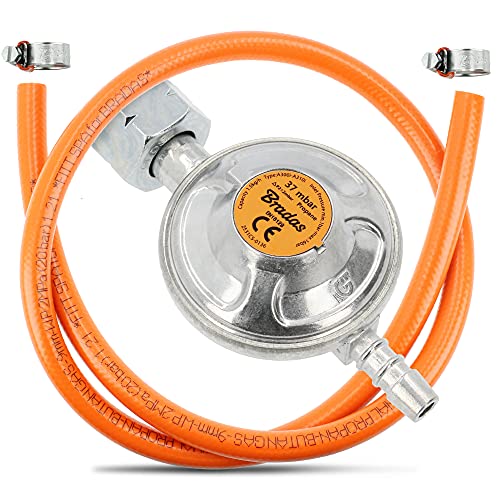 BRADAS® Régulateur de pression de gaz 37 mbar – 1,5 kg/h avec tuyau de gaz de 1 m de long + 2 colliers de serrage Kit de raccordement pour propane butane | Pour barbecue, camping, régulateur de
