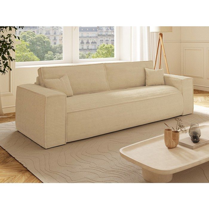 Canapé 4 places convertible en velours côtelé grosses côtes beige AMELIA