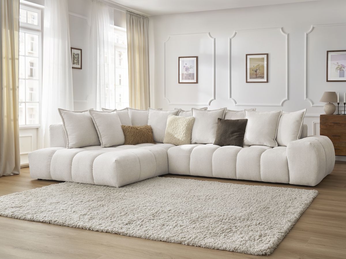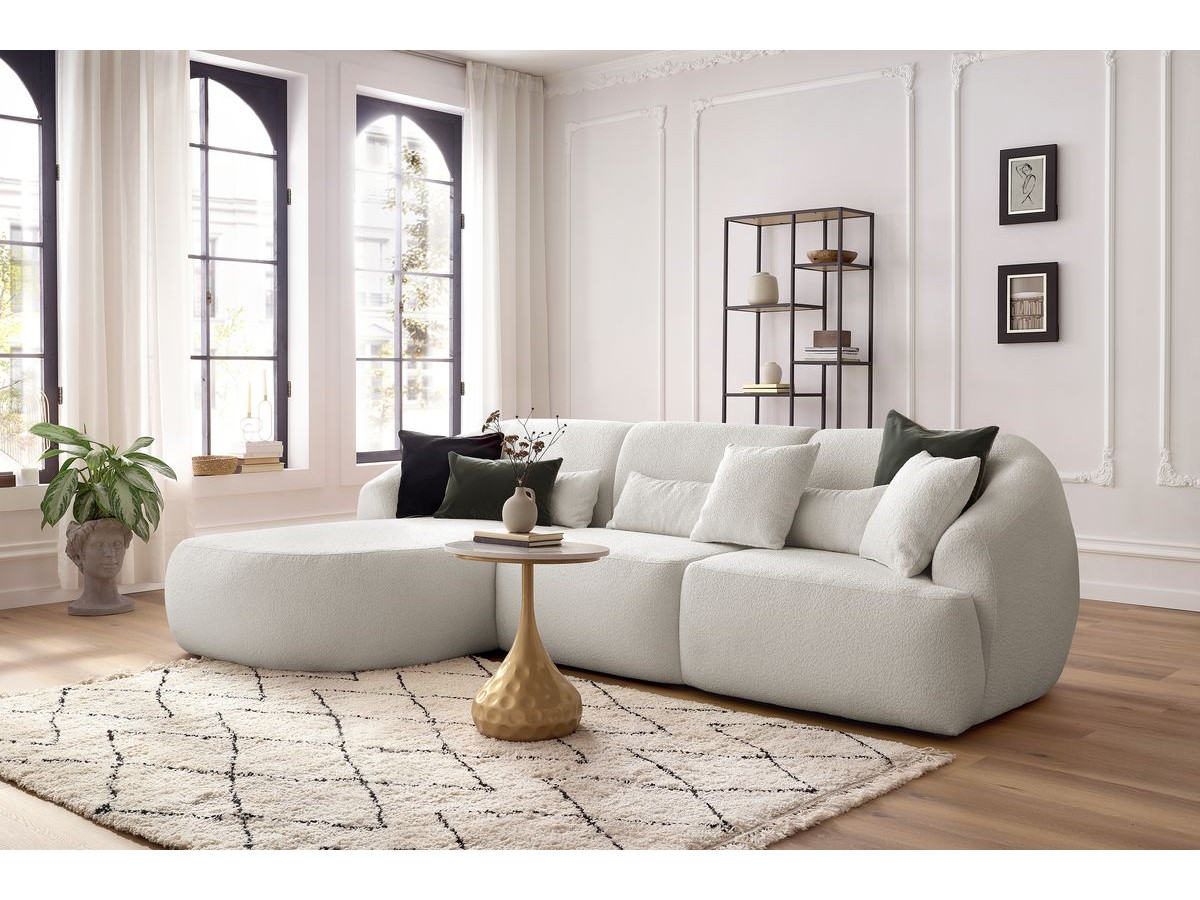 Canapé d'angle fixe ALESIA tissu bouclette blanc angle gauche BOBOCHIC 3 places