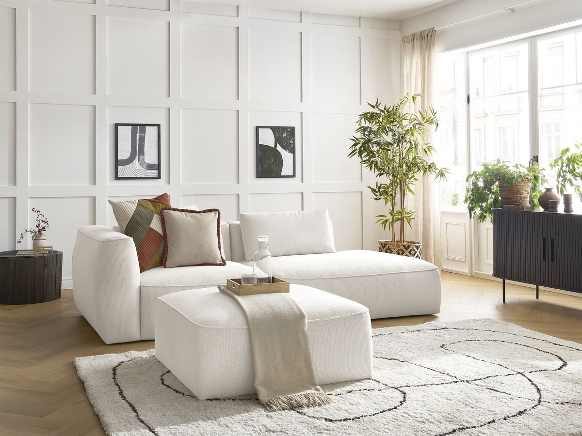 Canapé d'angle fixe modulable ANDA avec 1 méridienne et 1 chauffeuse bout de canapé blanc angle gauche BOBOCHIC 3 places