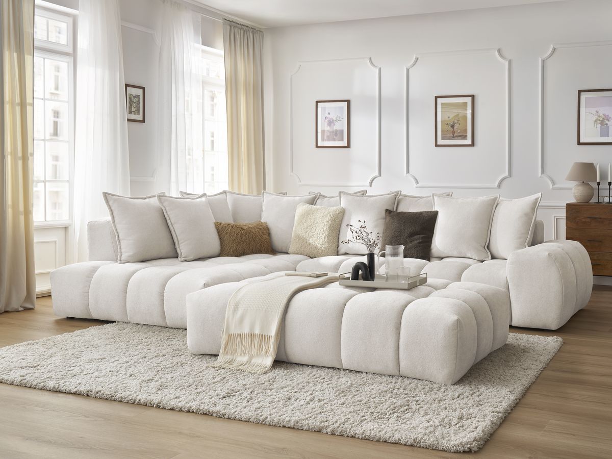 Bobochic Canapé panoramique fixe MEGEVE avec pouf tissu bouclette