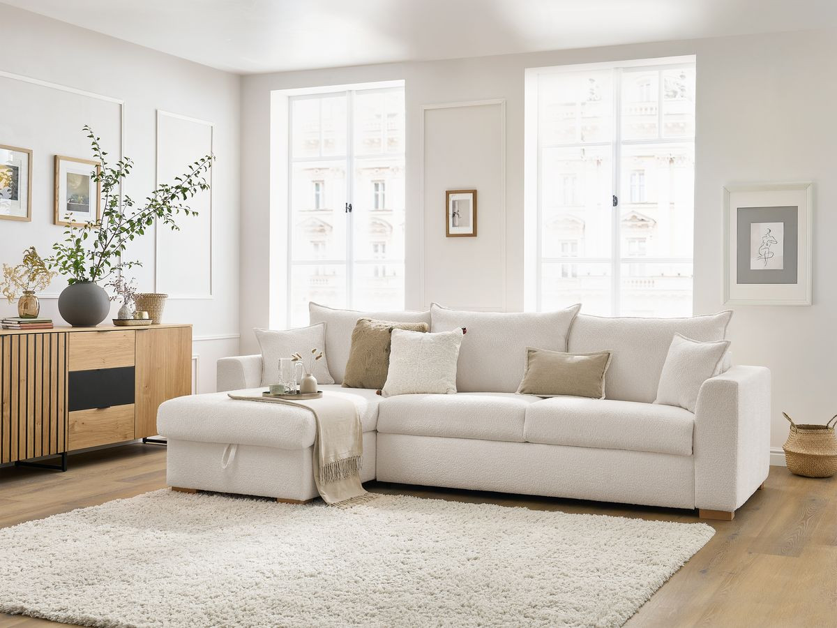Canapé d'angle réversible convertible ouverture express AUGUSTIN tissu bouclette blanc 160x200 BOBOCHIC 3 places