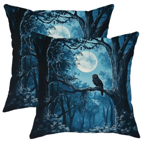 Lot de 2 housses de coussin carrées décoratives pour extérieur, maison, canapé, lit, canapé, 40,6 x 40,6 cm, motif hibou au clair de lune et forêt bleu nuit