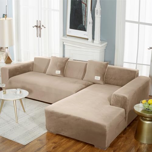 OKJK Couvre canapé d'angle en Velours pour Le Salon,Lavable en Machine,Protection canape Housse de canapé d'angle sectionnel,Tissu Doux et Confortable,Anti-poussière (Camel,4-Seats 235-300cm 1pc)