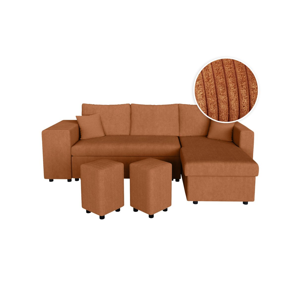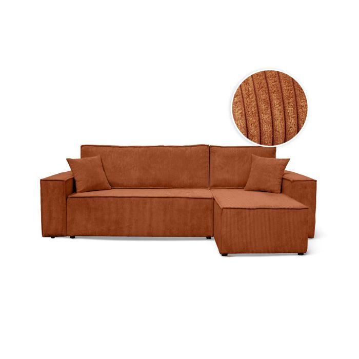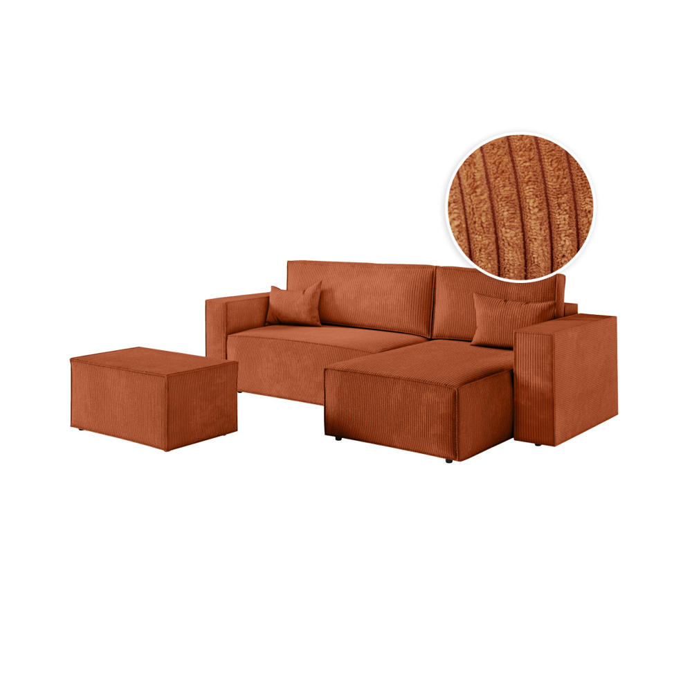 Canapé d'angle réversible convertible OSLO avec coffre 2 poufs à droite en velours côtelé terracotta