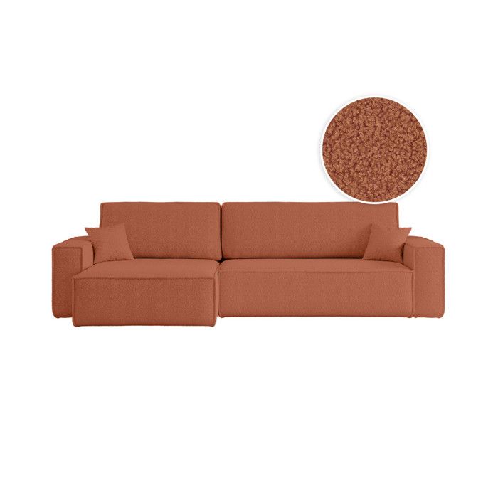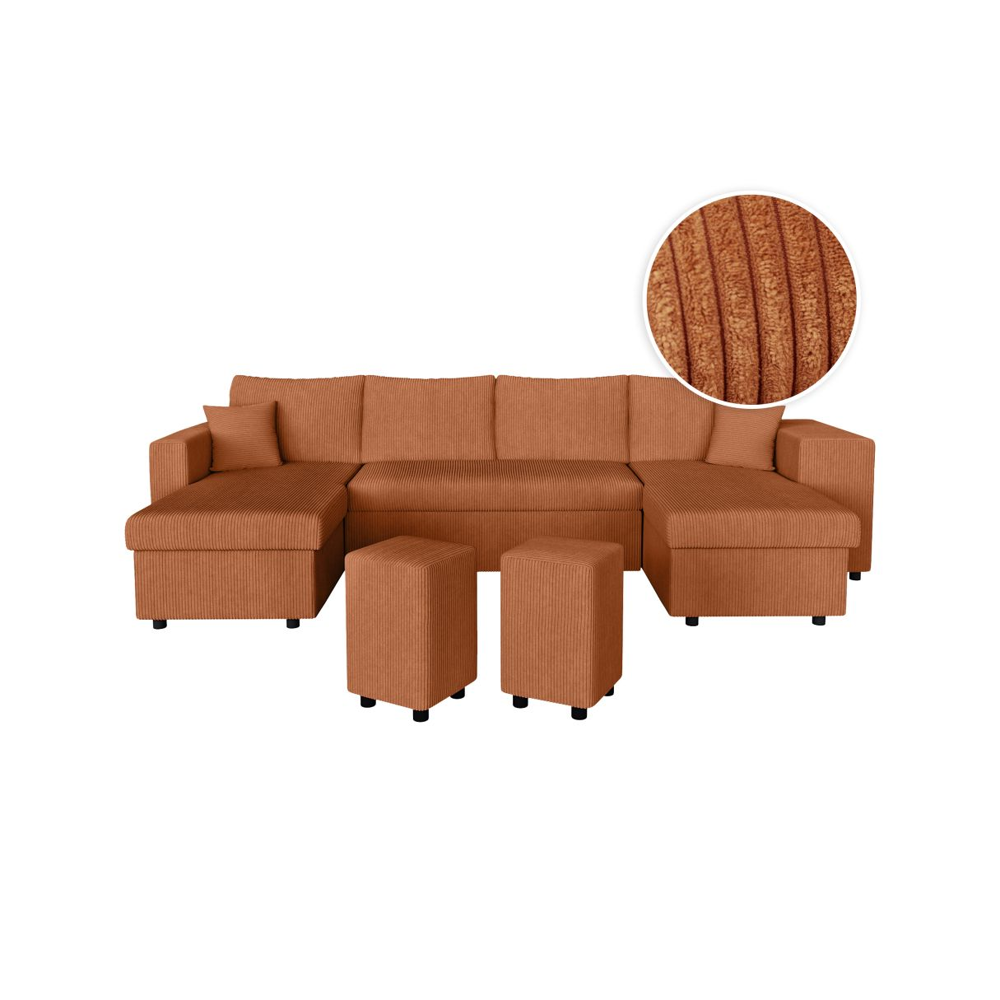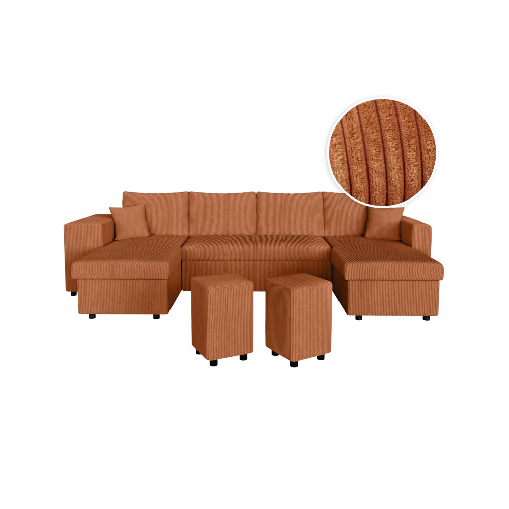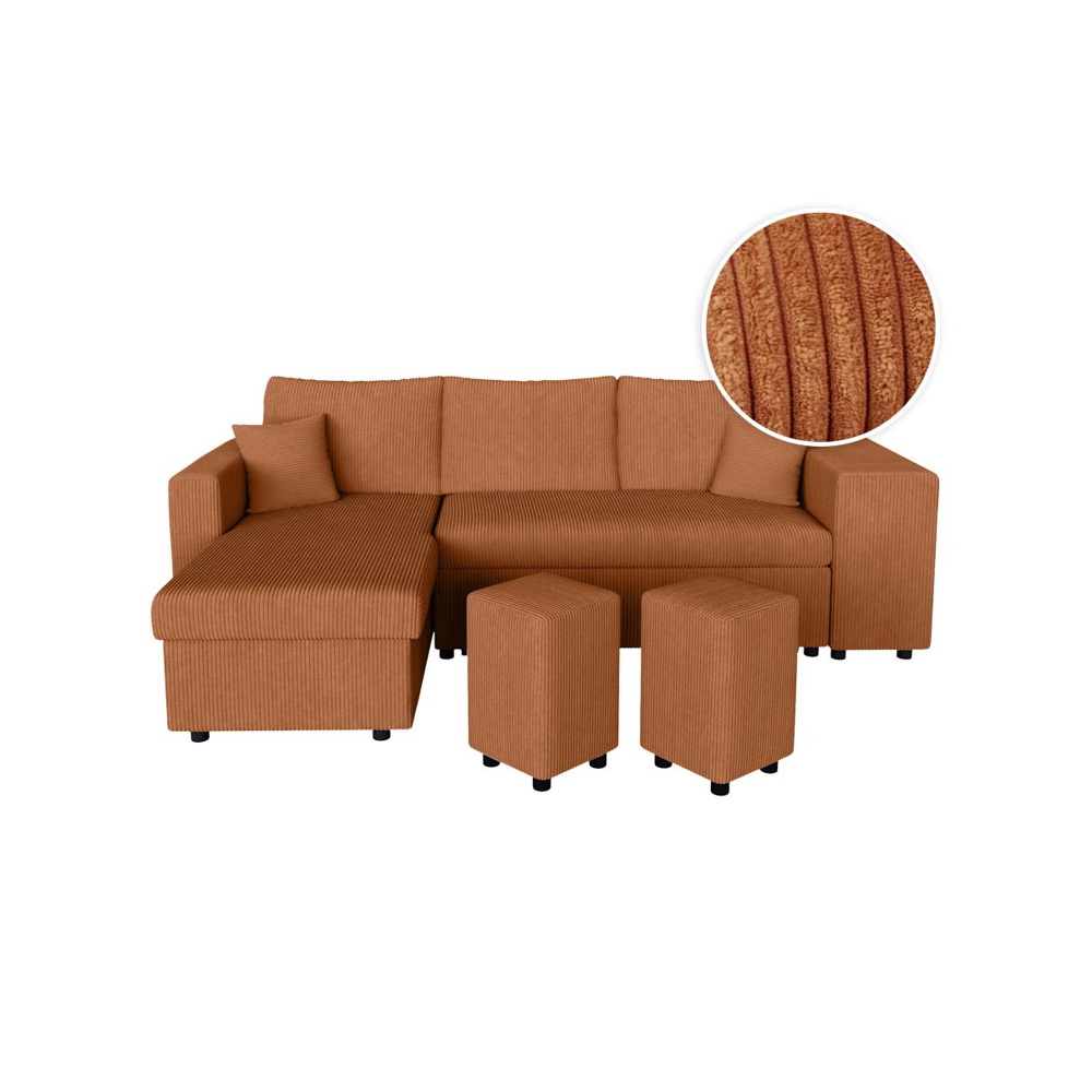 Canapé d'angle réversible convertible OSLO avec coffre 2 poufs à gauche en velours côtelé terracotta