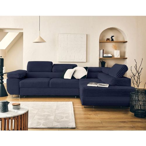 Lisbona - canapé d'angle droit 5 places convertible avec têtières en velours côtelé - bleu bleu Taille unique