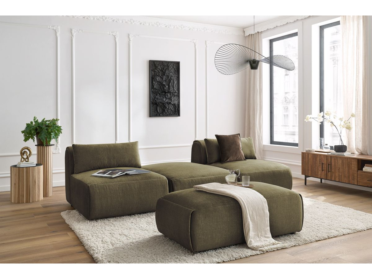 Canapé droit fixe 3 places JEANNE avec pouf tissu texturé vert BOBOCHIC 4 places
