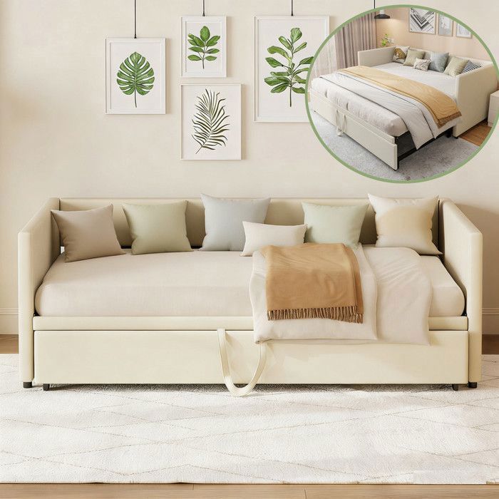 Lit adulte lit gigogne lit 90x200 avec sommier à lattes canapé-lit pour le salon tissu velours beige
