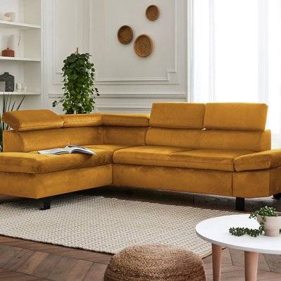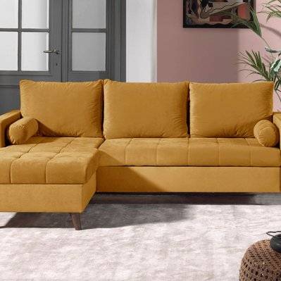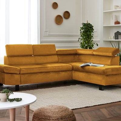 Lisa Design Nairobi - Canapé d'angle convertible en velours 5 places avec têtières Droit Jaune