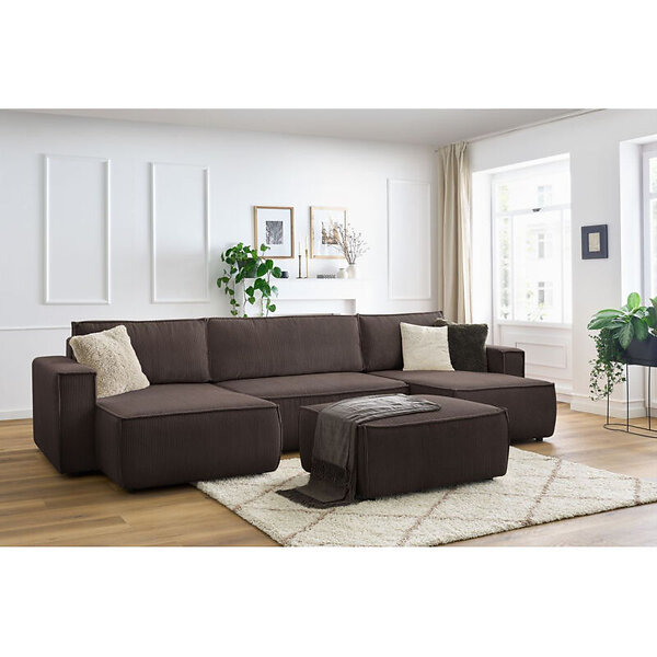 Bobochic Canapé panoramique fixe ultra moelleux VOLTAIRE velours côtelé avec pouf