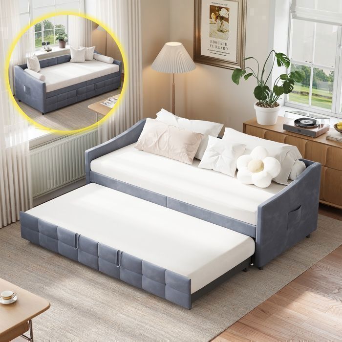 Canapé lit Convertible 2 Places 90x200cm Canape Lit Rembourré avec Sommier à Lattes Canapé-lit gigogne Extensible Velours Gris