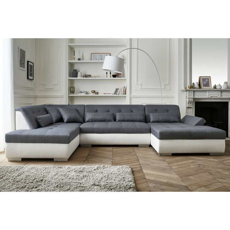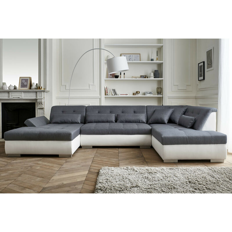 Vente Unique Canapé d'angle panoramique convertible en tissu et simili BOILEAU Bicolore Gris/Blanc Angle droit