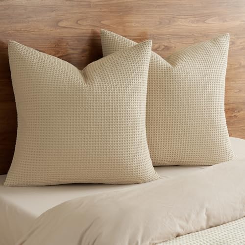 PHF Lot de 2 Housses de Coussin 100% Coton gaufré pour lit, canapé, Sofa, 66 x 66 cm, Kaki