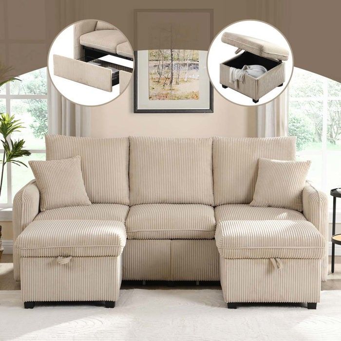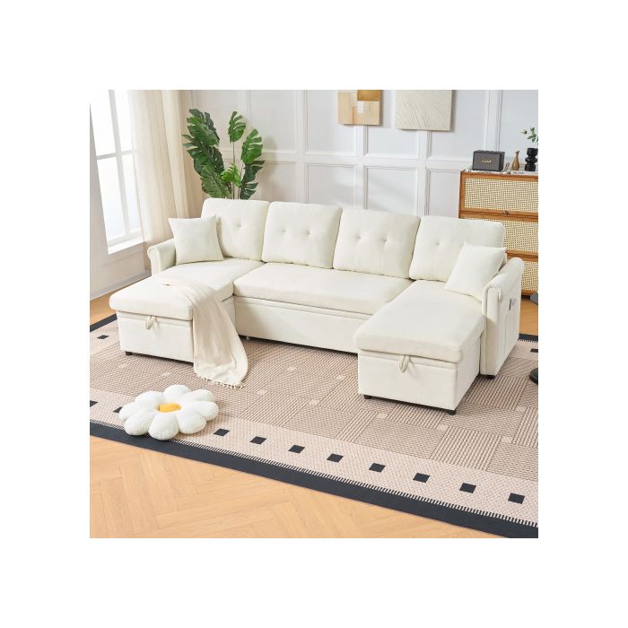 Canapé dangle U convertible 266×130×85 cm couchage 240×124×46 cm coffres de rangement chenille beige