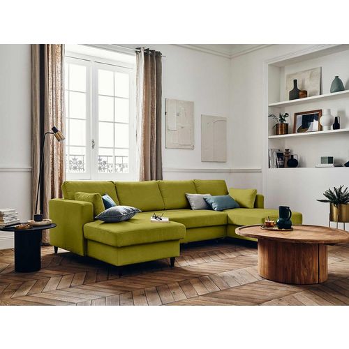 Apolline - canapé panoramique en u 7 places convertible avec coffres en tissu moucheté - vert olive vert olive Taille unique
