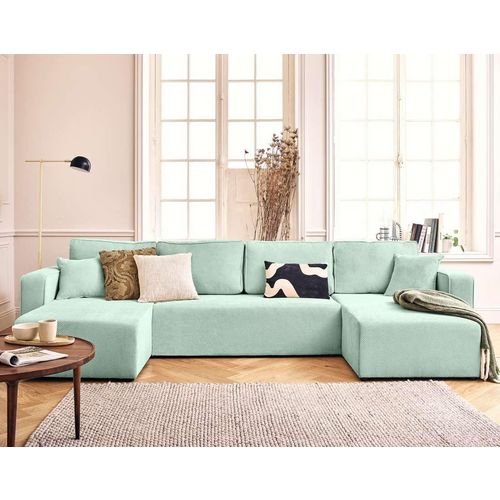 Dellia - canapé panoramique en u - 7 places - convertible - avec coffre - en velours côtelé - vert sauge vert sauge Taille unique