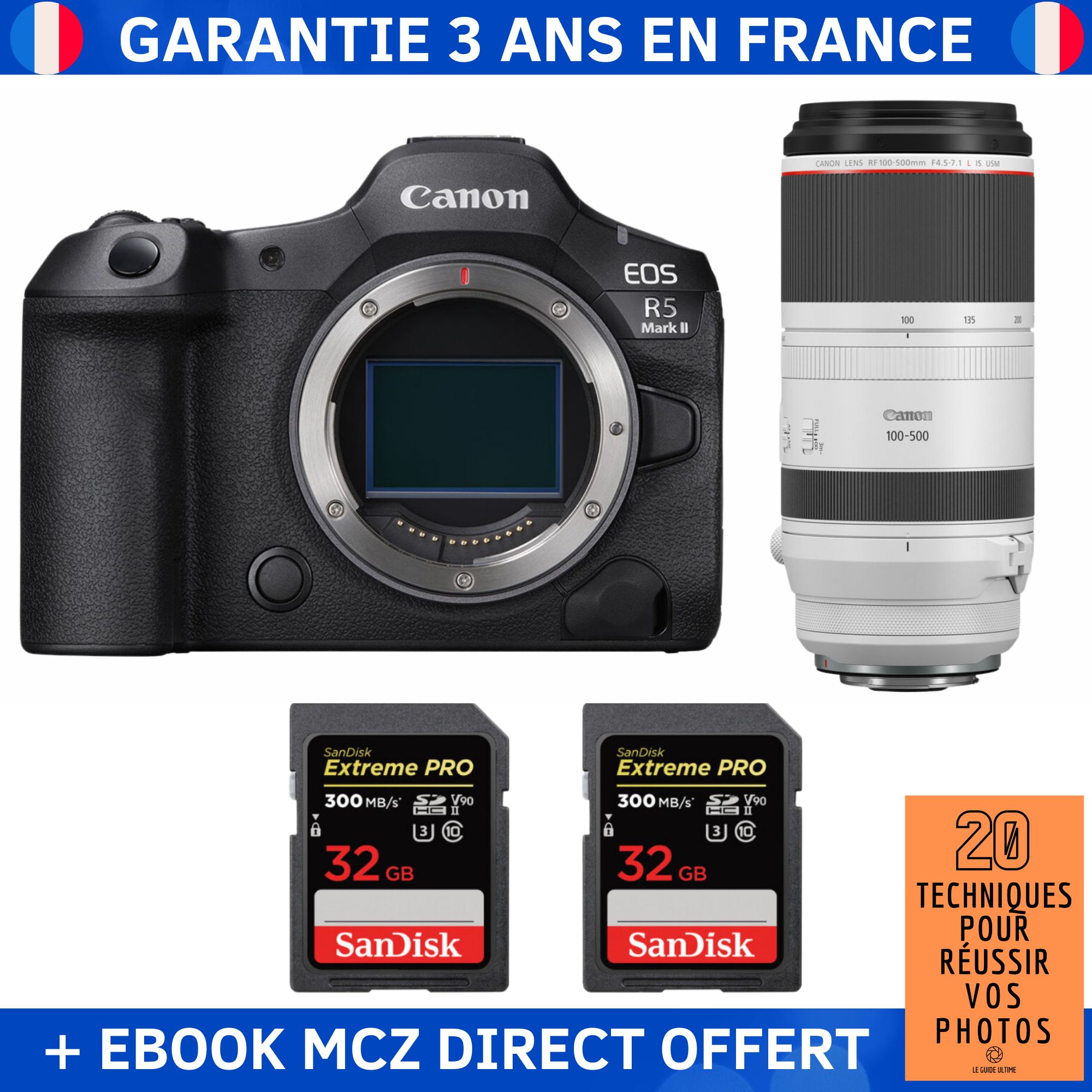 Canon EOS R5 Mark II + RF 100-500mm f/4.5-7.1 L IS USM + 2 SanDisk 32GB Extreme PRO UHS-II SDXC 300 MB/s + Ebook '20 Techniques pour Réussir vos Photos' - Appareil Photo Hybride Canon