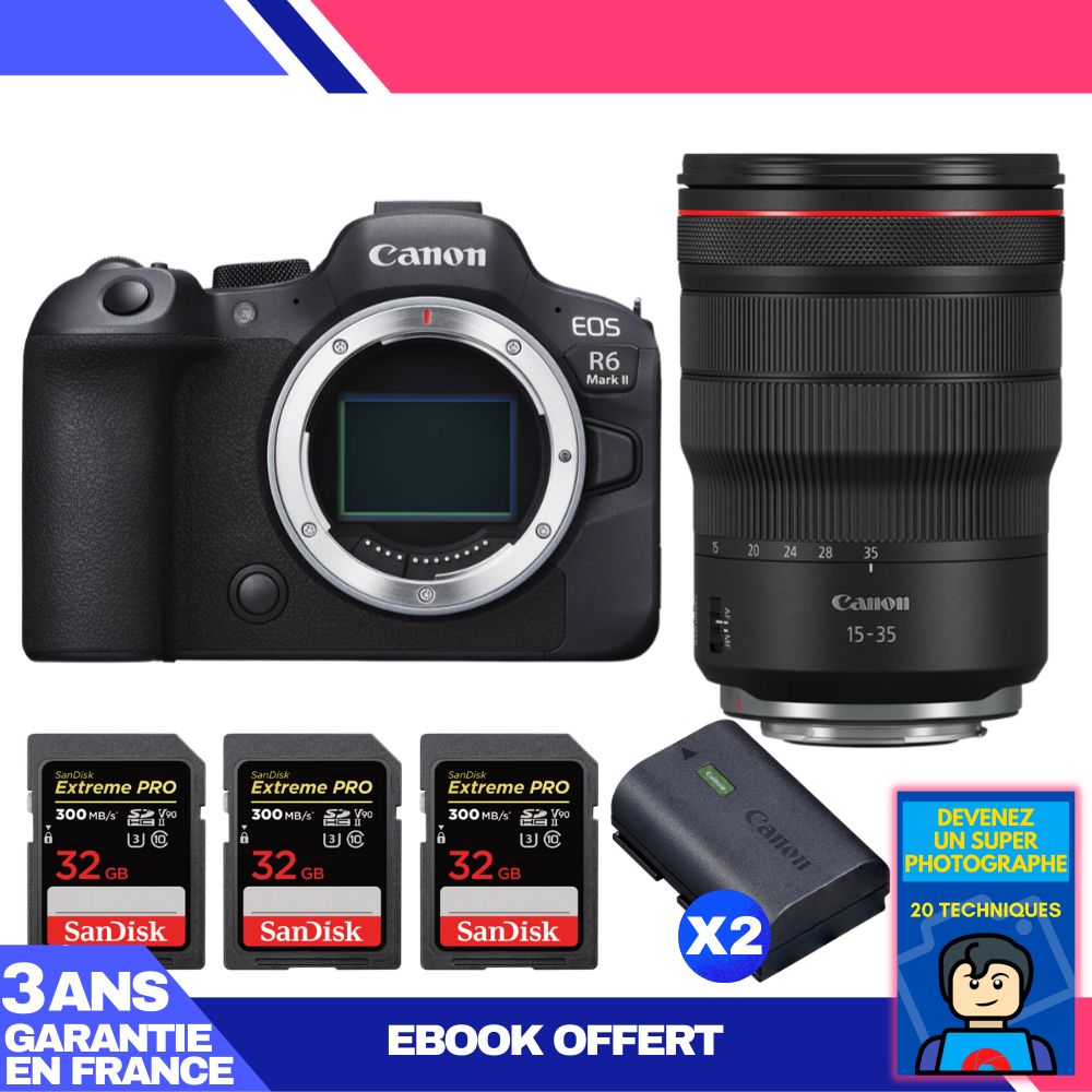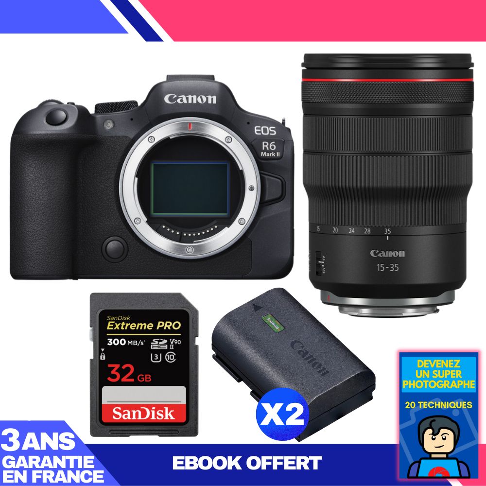 Boitier Canon EOS R6 Mark II + RF 15-35mm f/2.8 L IS USM + 3 SanDisk 32GB Extreme PRO UHS-II SDXC 300 MB/s + 2 Canon LP-E6NH + Ebook 'Devenez Un Super Photographe