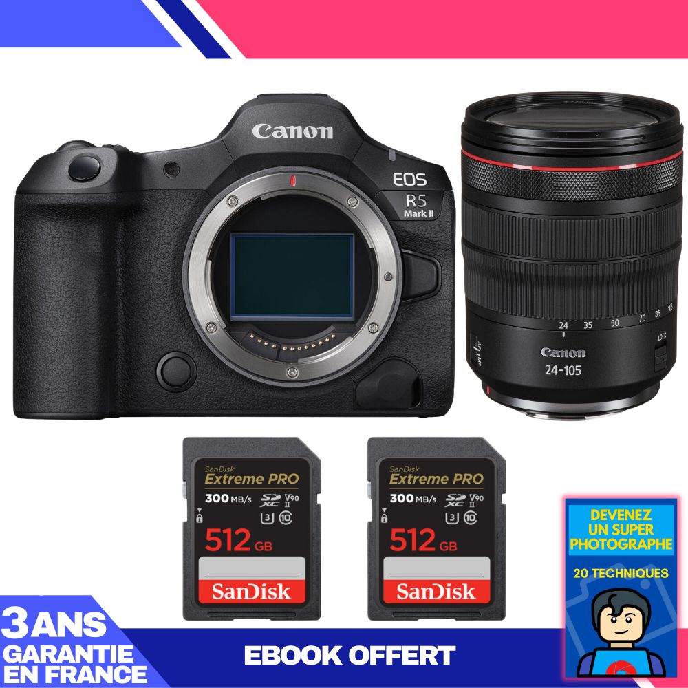 Canon EOS R5 Mark II + RF 24-105mm f/4 L IS USM + 2 SanDisk 512GB Extreme PRO CFexpress Type B + Ebook 'Devenez Un Super Photographe