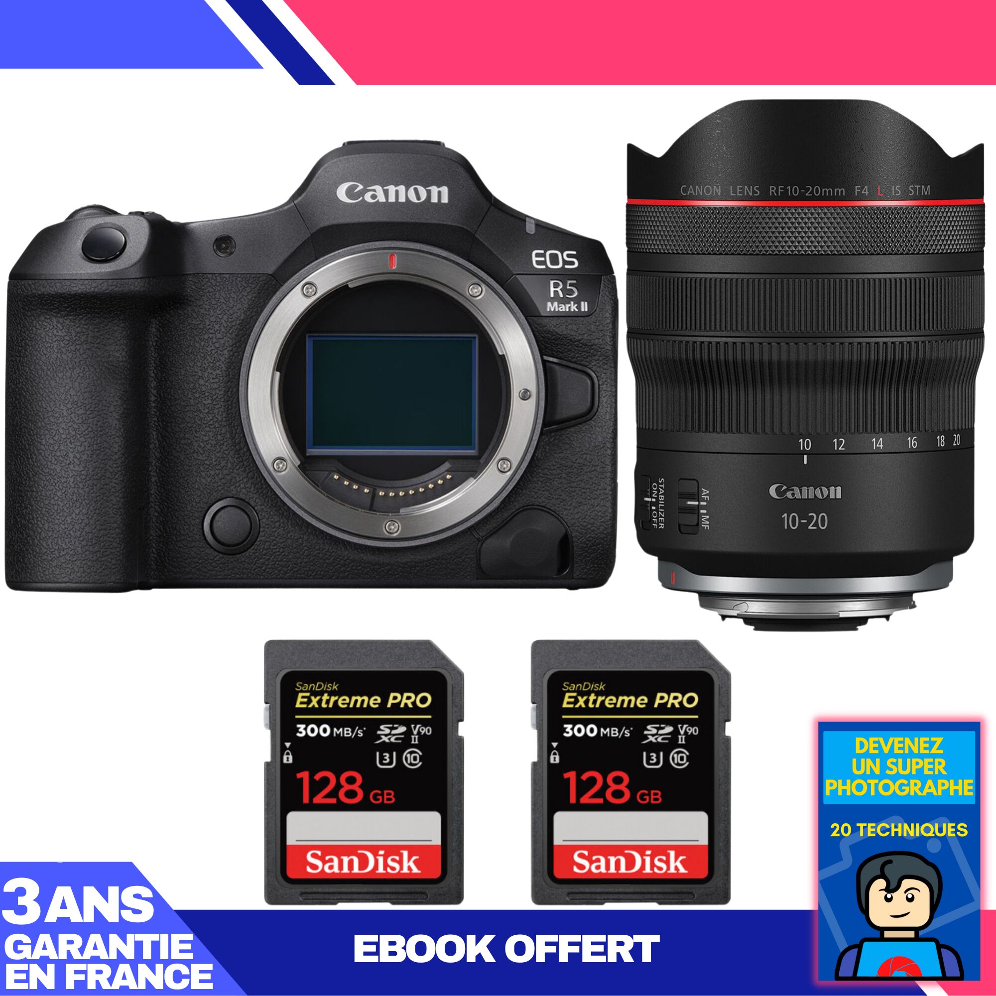 Boitier Canon EOS R5 Mark II + RF 10-20mm f/4 L IS STM + 2 SanDisk 256GB Extreme PRO UHS-II SDXC 300 MB/s + Ebook 'Devenez Un Super Photographe
