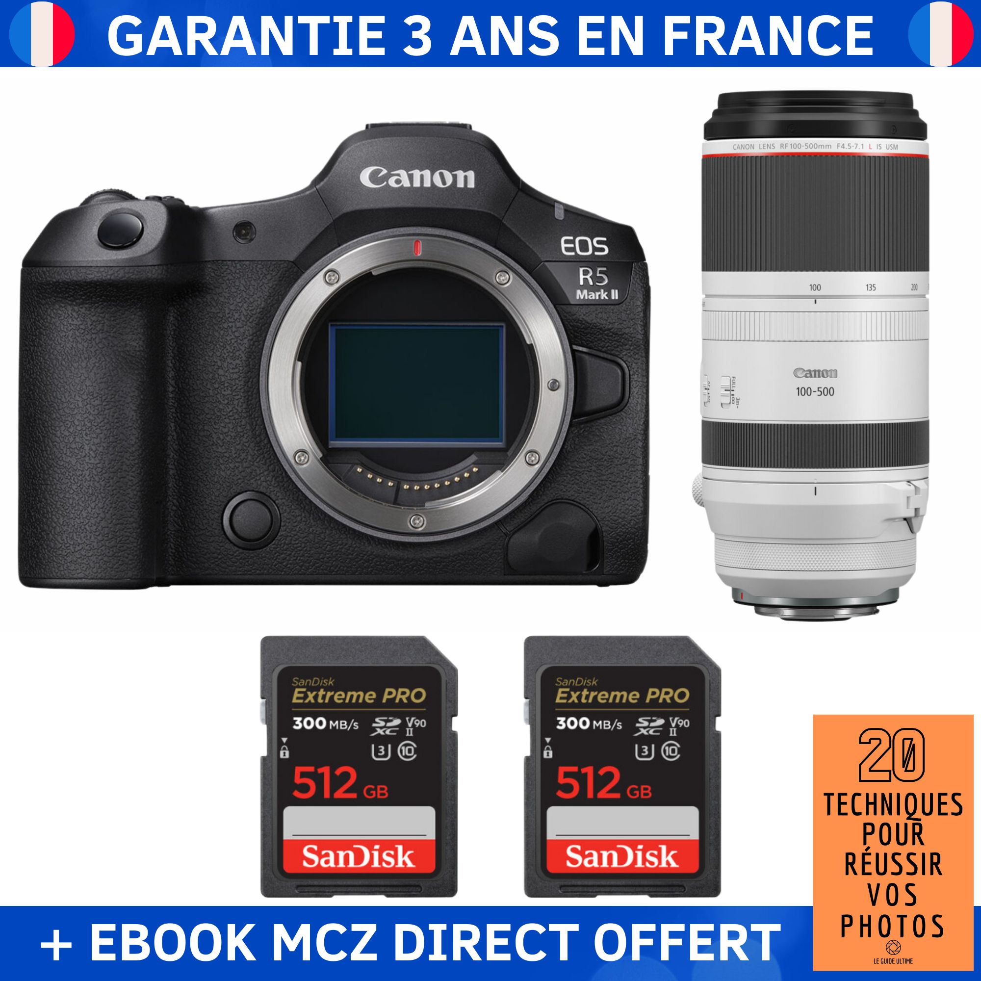 Canon EOS R5 Mark II + RF 100-500mm f/4.5-7.1 L IS USM + 2 SanDisk 256GB Extreme PRO UHS-II SDXC 300 MB/s + Ebook '20 Techniques pour Réussir vos Photos' - Appareil Photo Hybride Canon