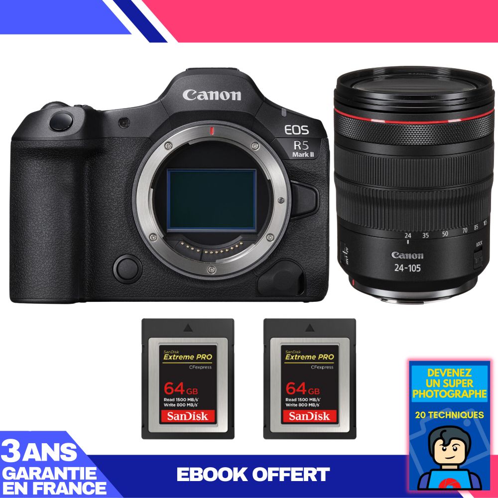 Boitier Canon EOS R5 Mark II + RF 24-105mm f/4 L IS USM + 2 SanDisk 64GB Extreme PRO CFexpress Type B + Ebook 'Devenez Un Super Photographe