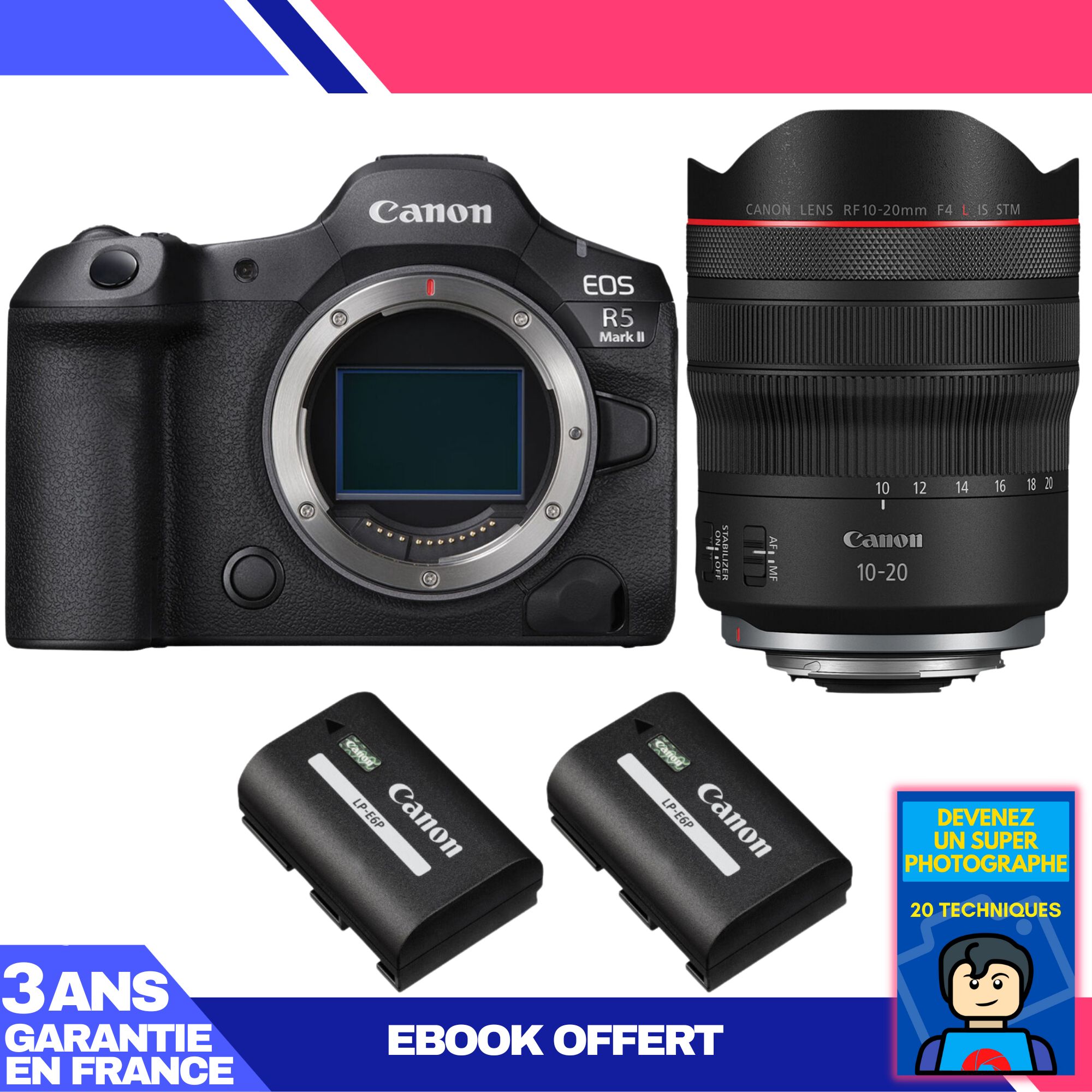 Boitier Canon EOS R5 Mark II + RF 10-20mm f/4 L IS STM + 2 Canon LP-E6P + Ebook 'Devenez Un Super Photographe