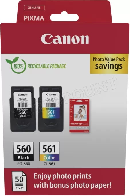 Canon PG-560/CL-561 Photo Value Pack - Brillant - 0.27 mm - pack de 2 - couleur (cyan, magenta, jaune), noir pigmenté - original - boîte - réservoir d'encre/kit papiers - pour PIXMA TS5350, TS5351, TS5352, TS5353, TS7450, TS7451