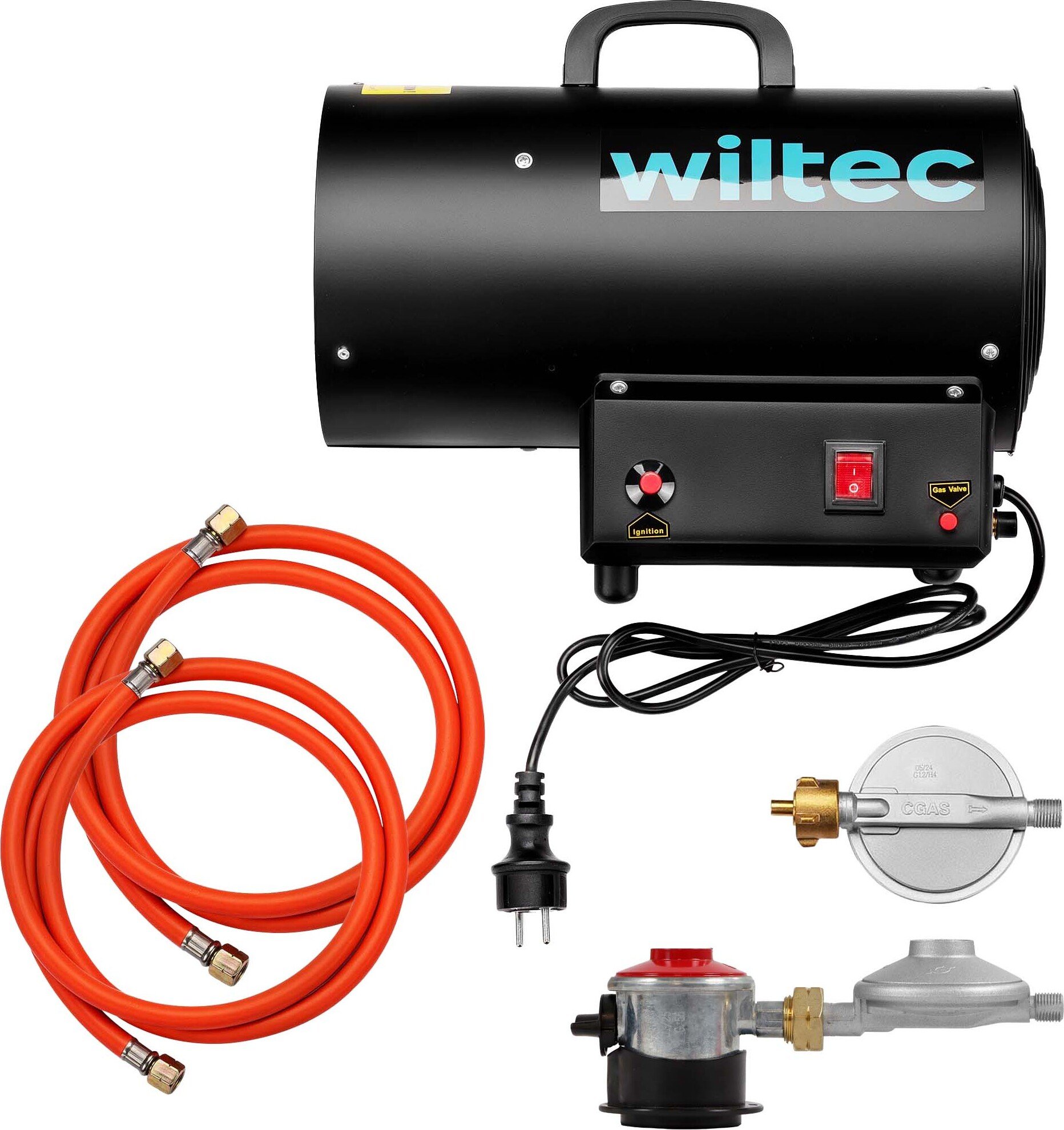 Wiltec Kit Générateur de chaleur et Pressostat raccords IT – Puissance calorifique 15 kW, moteur 30 W – Débit d’air 320 m³/h – Fonctionnement sur gaz GPL – avec régulateur et tuyau – Canon air chaud