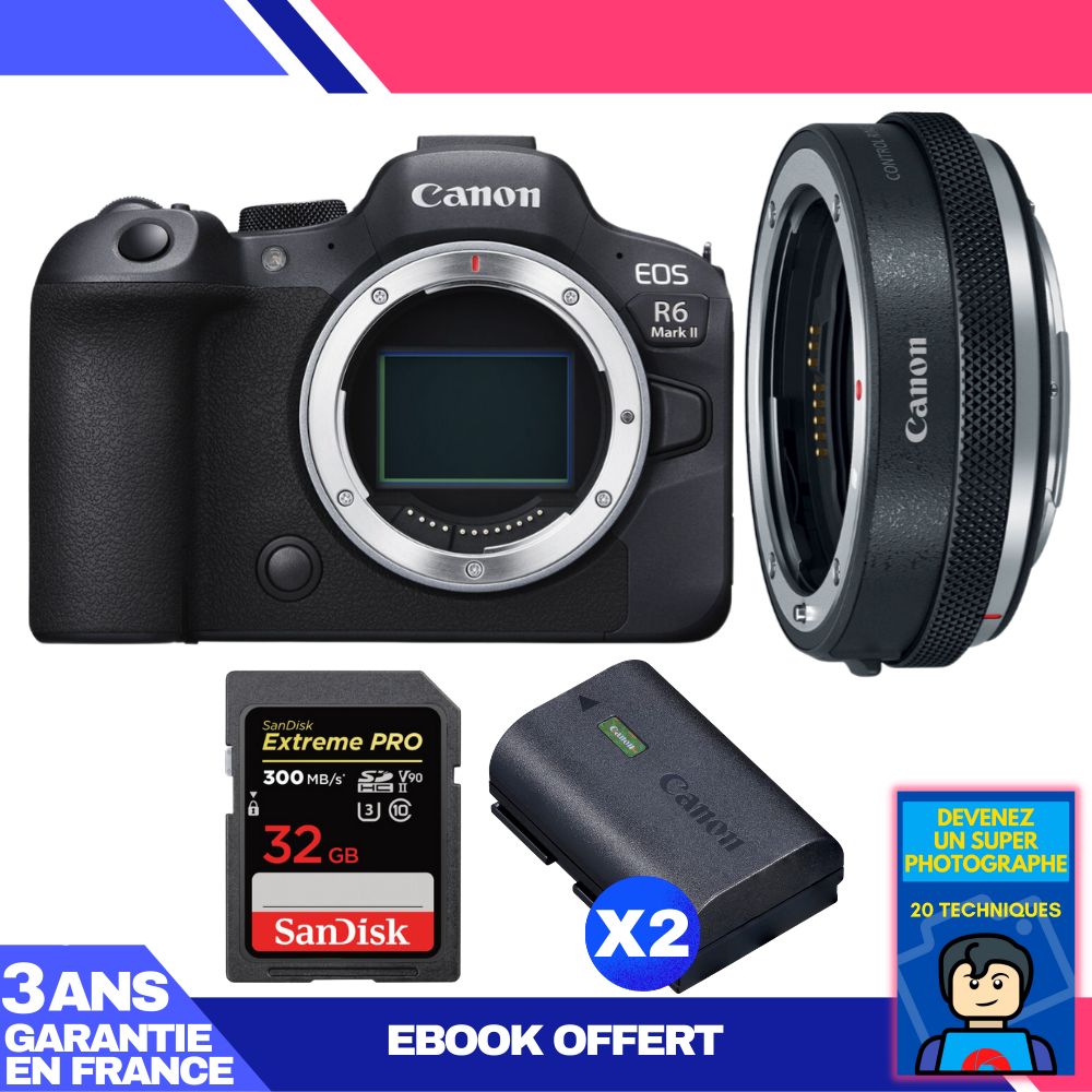 Boitier Canon EOS R6 Mark II + Canon EF-EOS R Premium + 3 SanDisk 32GB Extreme PRO UHS-II SDXC 300 MB/s + 2 Canon LP-E6NH + Ebook 'Devenez Un Super Photographe
