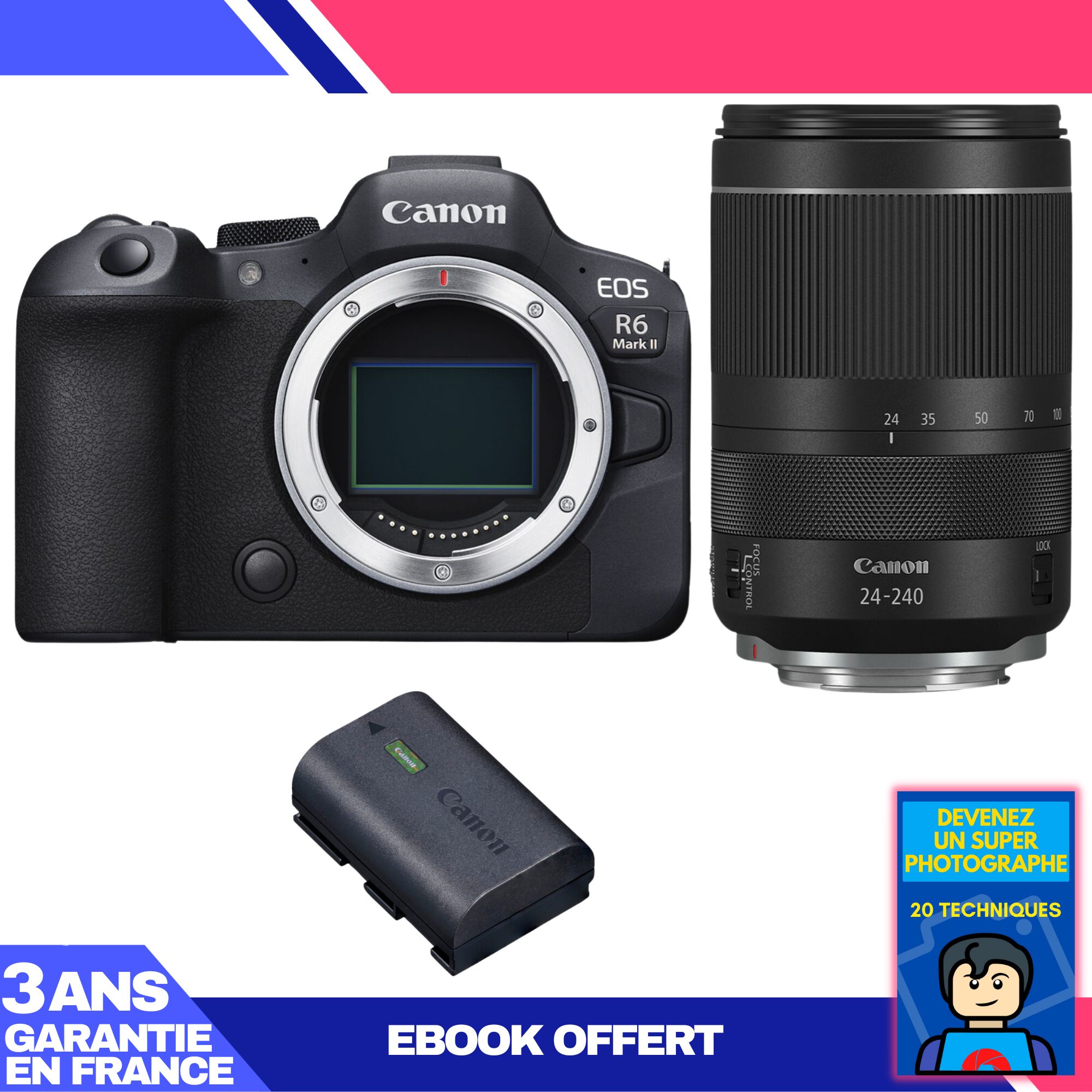 Boitier Canon EOS R6 Mark II + RF 24-240mm f/4-6.3 IS USM + 1 SanDisk 64GB Extreme PRO UHS-II SDXC 300 MB/s + 3 Canon LP-E6NH + Ebook 'Devenez Un Super Photographe