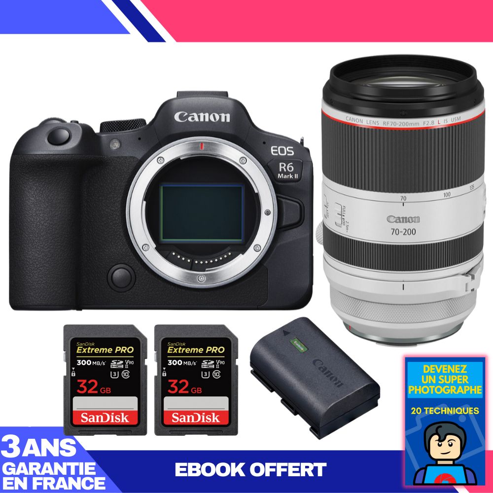 Boitier Canon EOS R6 Mark II + RF 70-200mm f/2.8 L IS USM + 2 SanDisk 32GB Extreme PRO UHS-II SDXC 300 MB/s + 2 Canon LP-E6NH + Ebook 'Devenez Un Super Photographe
