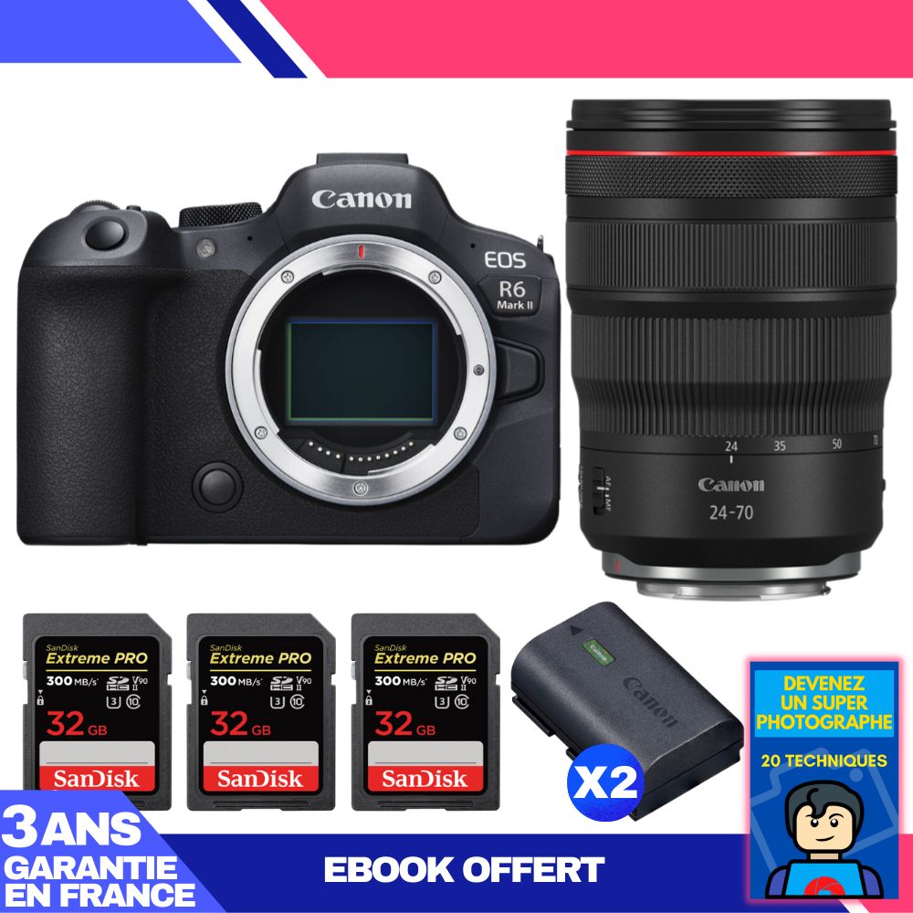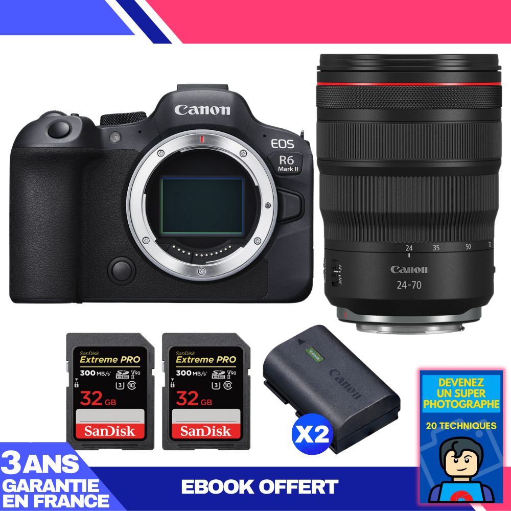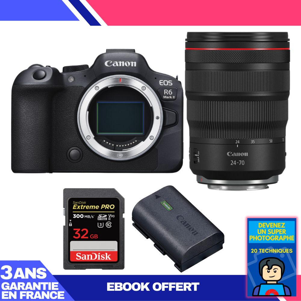 Boitier Canon EOS R6 Mark II + RF 24-70mm f/2.8 L IS USM + 2 SanDisk 32GB Extreme PRO UHS-II SDXC 300 MB/s + 3 Canon LP-E6NH + Ebook 'Devenez Un Super Photographe