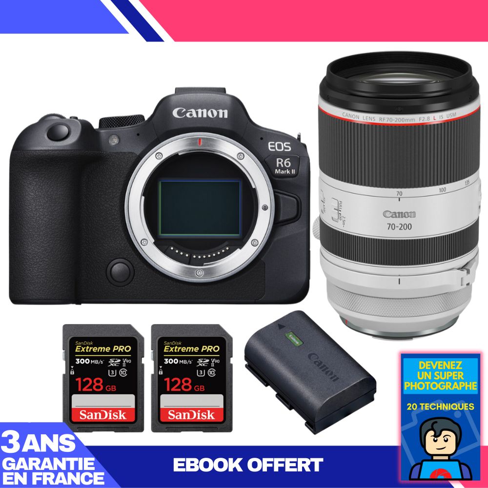 Boitier Canon EOS R6 Mark II + RF 70-200mm f/2.8 L IS USM + 2 SanDisk 128GB Extreme PRO UHS-II SDXC 300 MB/s + 1 Canon LP-E6NH + Ebook 'Devenez Un Super Photographe