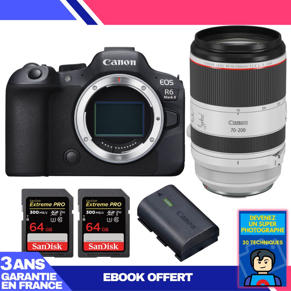 Boitier Canon EOS R6 Mark II + RF 70-200mm f/2.8 L IS USM + 3 SanDisk 64GB Extreme PRO UHS-II SDXC 300 MB/s + 2 Canon LP-E6NH + Ebook 'Devenez Un Super Photographe